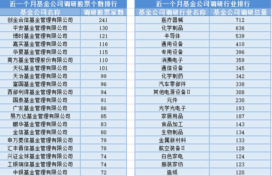 近一个月(10月15日-11月14日),创金合信基金参与公司调研的数量最多,共调研241家上市公司,然后调研较为活跃的还有平安基金、博时基金和嘉实基金,分别调研130家、121家、116家上市公司;从调研行业上来看,基金公司对医疗器械行业的上市公司调研次数最多,共有712次,其次是化学制品行业,基金公司调研了636次。
