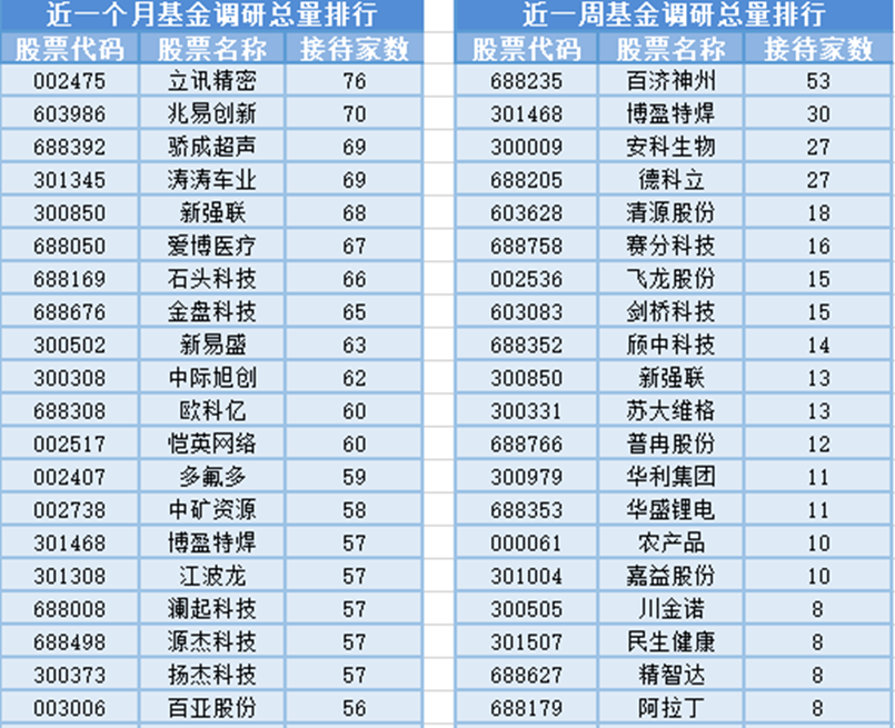 从个股调研情况上来看,最近1个月(10月15日-11月14日)最受公募基金关注的是立讯精密,属于消费电子行业,主营业务为从事消费电子、通信及数据中心、汽车、医疗等领域相关零组件、模组及系统集成业务。共有76家基金管理公司参与调研,其次是兆易创新和骄成超声,分别接受70家、69家基金管理公司的调研。