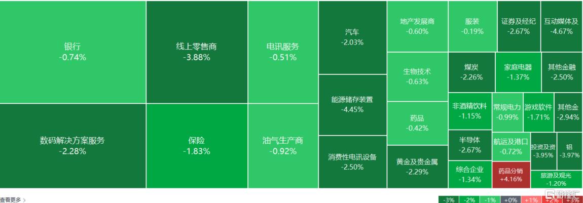 盘面上,权重科技股集体下跌,百度跌超7%,京东跌超6%,阿里巴巴跌超4%;影视股领跌,大麦娱乐跌超10%;比特币跌破97000美元,加密货币概念股集体下挫;银行、保险、中资券商股等大金融股低迷,中信证券、广发证券、中国银河跌超4%;半导体芯片股、汽车股、光伏股、航空股、军工股、黄金股等齐跌。