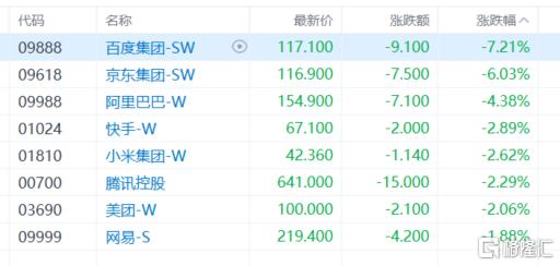 权重科技股集体下跌,百度跌超7%,京东跌超6%,阿里巴巴跌超4%,快手、小米、腾讯控股、美团跌超2%,网易跌超1%。
