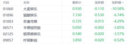 影视股领跌,大麦娱乐跌超10%,猫眼娱乐、欢喜传媒、丰德丽控股、稻草熊娱乐、柠萌影视等跟跌。