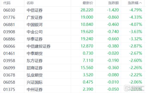 中资券商股低迷,中信证券、广发证券、中国银河跌超4%,中金公司、华泰证券、中信建投证券、中泰期货、东方证券、招商证券等跟跌。