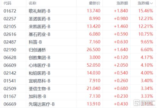 生物医药股涨幅居前,歌礼制药涨超15%,圣诺医约、来凯医药、基石药业等跟涨。
