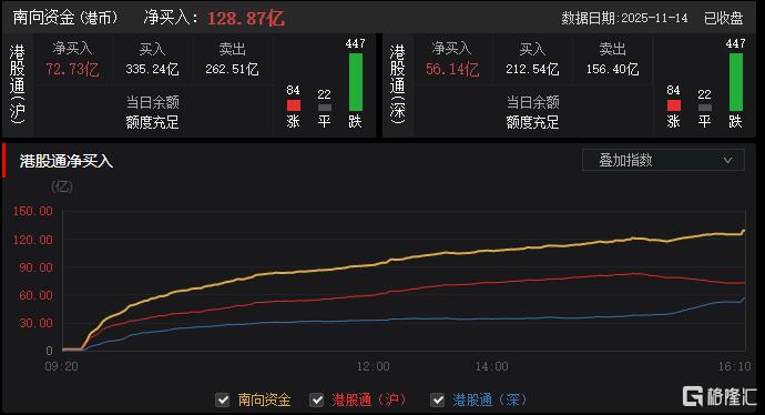 今日,南向资金净买入128.87亿港元,其中港股通(沪)净买入72.73亿港元,港股通(深)净买入56.14亿港元。