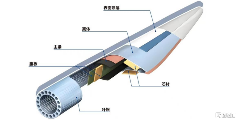 风电叶片结构包括壳体、主梁、腹板、叶根、表面涂层等,壳体形成叶片气动外形用于捕捉风能;主梁负责核心支撑,提供叶片刚度即抗弯和抗扭能力;腹板负责支撑截面结构,预制后固定在主梁上;叶根增强层将主梁上载荷传递到主机处;表面涂层起到防止腐蚀和减少摩擦的作用。