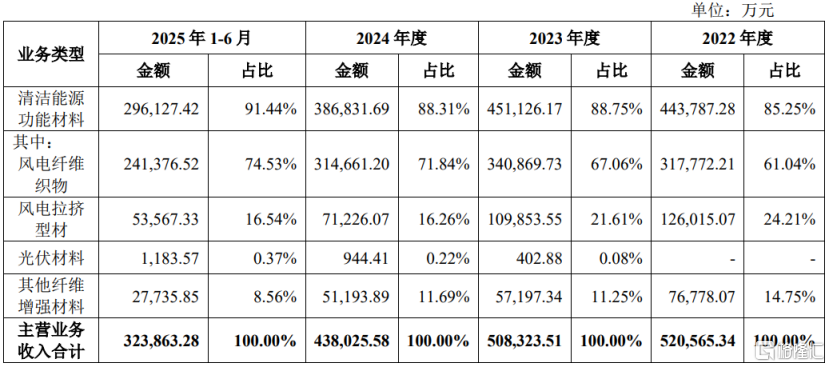 具体来看,2022年至2025年上半年(简称“报告期”),振石股份85%以上的收入主要来自清洁能源功能材料,其中,风电纤维织物的营收占比在60%以上,风电拉挤型材的营收占比在20%左右,光伏材料的营收占比较低。