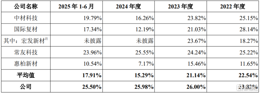 报告期内,振石股份的主营业务毛利率分别为23.82%、26%、25.98%和25.5%,高于可比上市公司主营业务毛利率平均值,公司称主要系业务结构、产品属性及细分产品结构等方面存在差异所致。