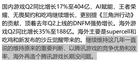 “继续维持这几年一直说的维持原来的重要判断,以腾讯游戏的竞争优势和效率,海外再造个腾讯游戏长期没问题。”这段话强调是重要判断,语气非常肯定。