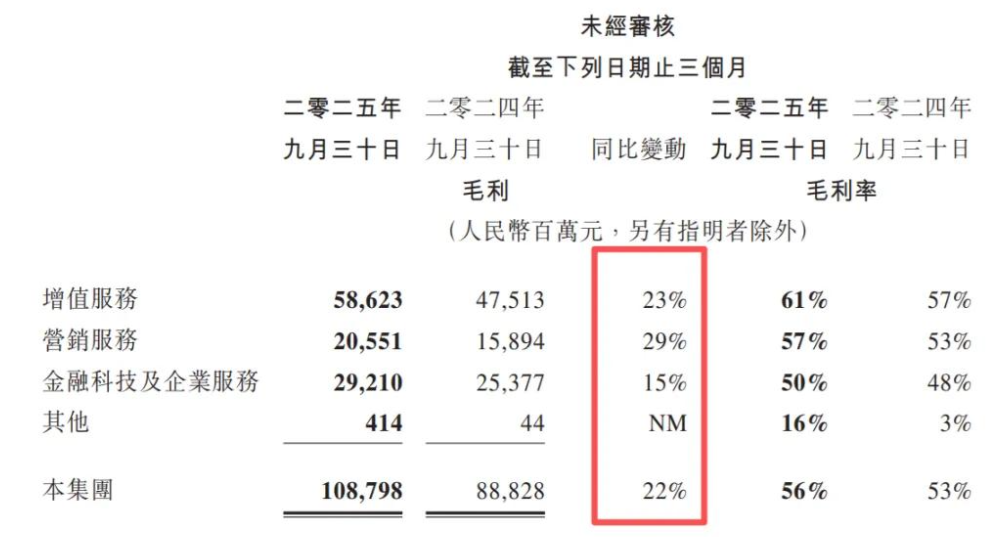 金融科技服务收入同比以高个位数百分比增长,主要受益于商业支付活动及消费贷款服务的收入增加;企业服务收入同比增长十几个百分点,受益于云服务的收入增长,以及由于微信小店交易额扩大而带动的商家技术服务费收入增长。