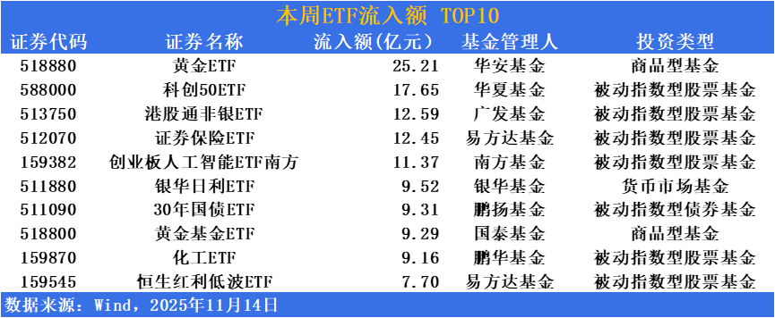 本期(2025年11月3日-11月6日),在板块内部轮动显著加速与长期低利率并存的市况下,市场资金对避险属性的强化及确定性收益渠道的配置诉求持续显现,因此“牛市旗手”券商板块资金流入明显,相关产品不断冲击历史新高,这类资产兼具高弹性和政策预期,成为资金对冲市场波动的利器。黄金ETF(518880)流入超25亿,位居流入榜第一。科创50ETF(588000)流入超17亿、港股通非银ETF(513750)流入超12亿,位居二、三。