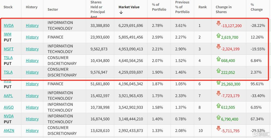 特斯拉位居第五,持仓约958万股,持仓市值约为43亿美元,占投资组合比例的1.90%,持仓数量较上季度小幅增长2.37%。