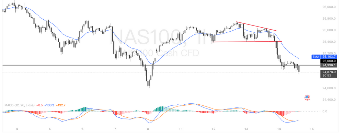 纳指100在经历连日回调后,技术面已进入明显的弱势结构。图中可见,指数在 25,600 一带形成“下降三角形”后向下跌破,随后一路沿 20EMA 下滑,空头主导节奏明确。昨日更进一步跌破前低支撑(约 25,000),并多次在黑色水平支撑带附近反复震荡,显现买盘承接力偏弱。