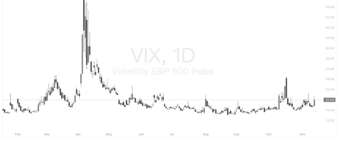 VIX 指数近日再度向上突破 20 大关,显示美股波动率显著升温,投资者风险偏好明显收缩。整体结构上可见,VIX 在 9–10 月期间多次于 16–18 区间构筑底部,一旦出现宏观不确定或科技股大幅波动,便迅速弹升。当前的上涨幅度虽不及 4 月的极端尖峰,但与近期 AI 权值股回调、降息预期急速降温的市场环境相吻合,属于典型的“避险抬头”反应。