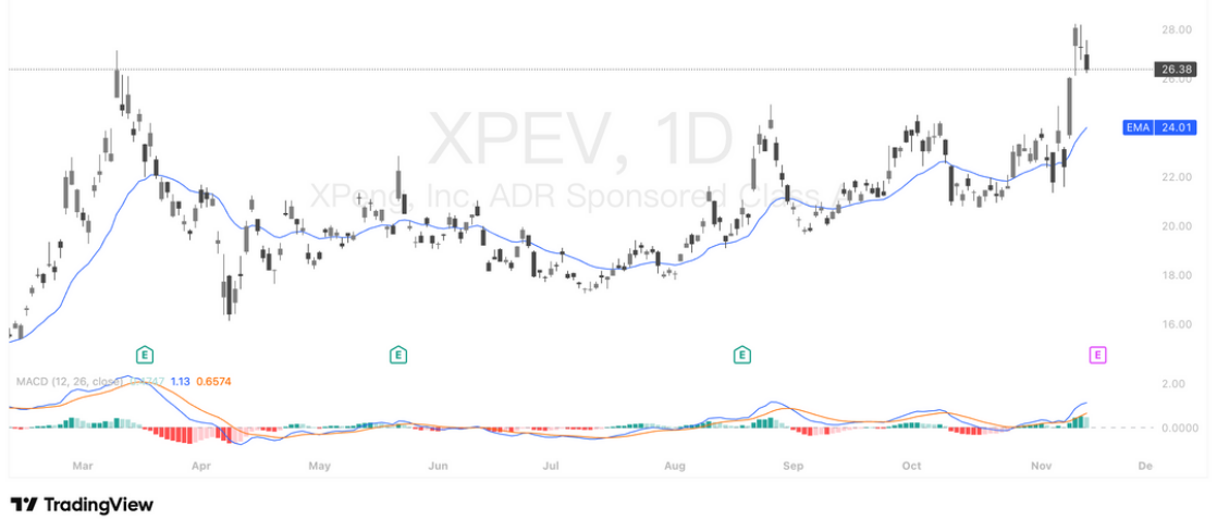 整体而言,XPEV 当前处于“强势突破后的小幅回踩”,技术面健康,回挡反而为财报前的低风险布局窗口。短线支撑看 25 与 24,突破 28 则视为下一波趋势启动信号。
