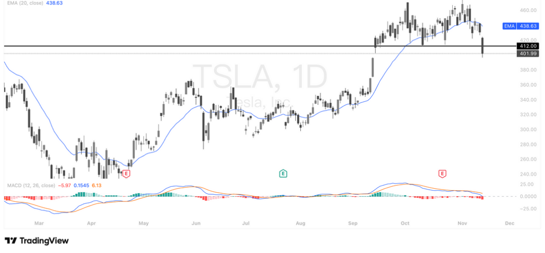 Tesla 的技术结构已全面转弱。本周早些时候已提示特斯拉出现潜在M顶形态,昨日的大阴线正式 跌破颈线(约 412 美元),不仅确认了该反转结构,也触发了技术面的系统性卖压。加上股价同步跌破 20 日 EMA(438),形成“结构反转+均线破位”的双重空头讯号。