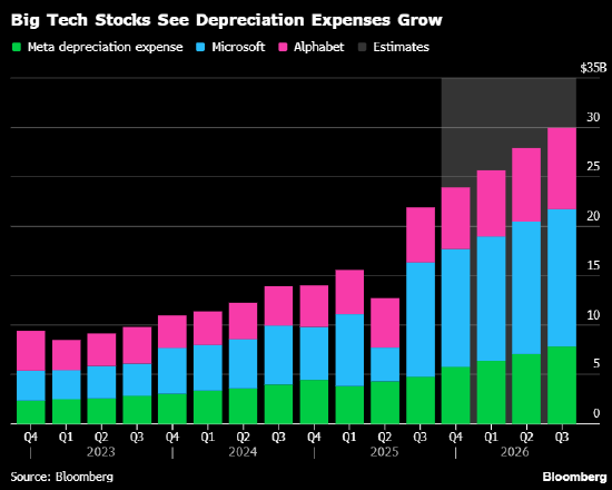 Saglimbene指出:“企业升级服务器、网络设备和芯片的行为并不新鲜,但我们从未见过这种规模的延长折旧,这让投资者感到不安。”