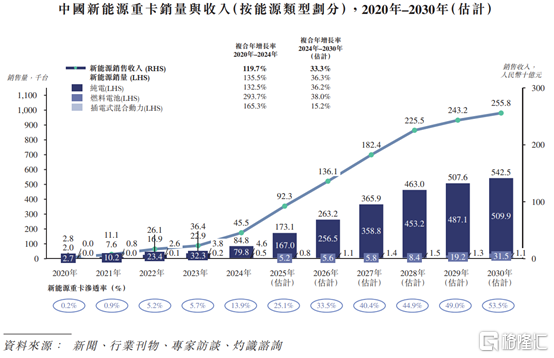 在政策的大力支持下,国内新能源重卡的普及将进一步加快。2025年9月中国新能源重卡的渗透率达到28.9%,预计到2030年将进一步提升至53.5%,年销量达54.25万台,市场规 模达到2558亿元,复合年增长率分别为36.3%及33.3%。