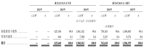 具体来看,2022年至2025年上半年(简称“报告期”),新能源重卡销售业务为公司贡献了99%以上的收入,另外还有小部分收入来自销售零部件。