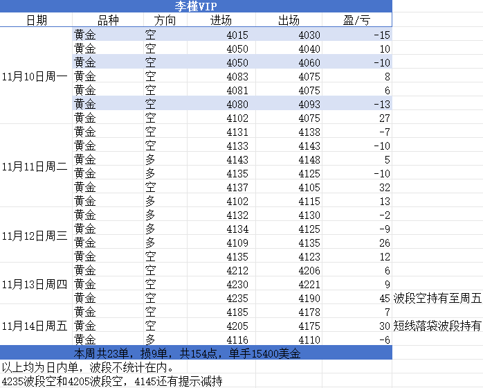 回顾近期:周四4235、周五4185先后开启波段空,周五美盘黄金最低触及4032,这波波段空利润翻了又翻,把握趋势拐点。周四公开也有给到4230-40空,周五4208空,走势反弹都有给到机会。