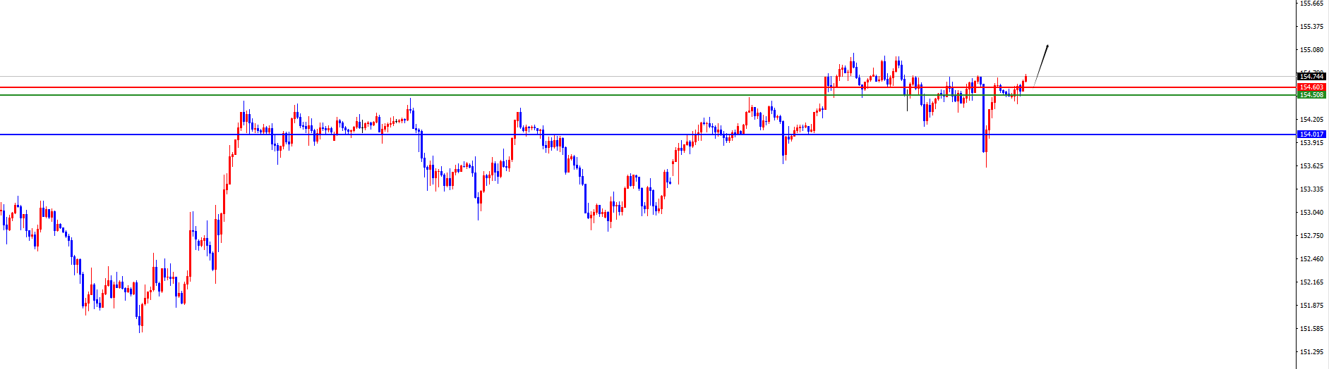 短线分水岭154.50-60区域,价格没有出现反转信号之前维持多