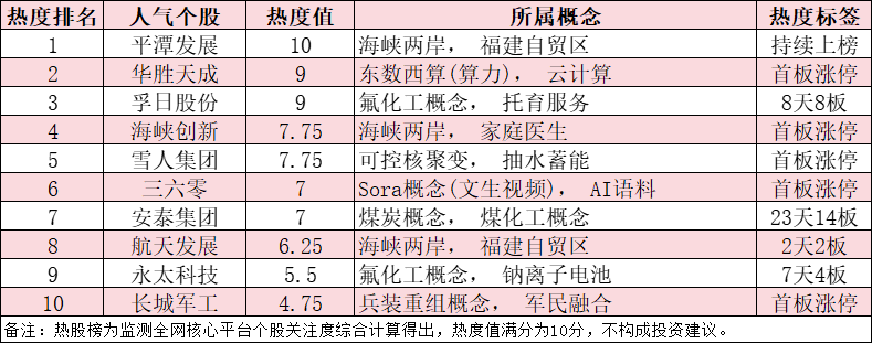 今日,A股十大人气热股如下:平潭发展、华胜天成、孚日股份、海峡创新、雪人集团、三六零、安泰集团、航天发展、永太科技、长城军工。