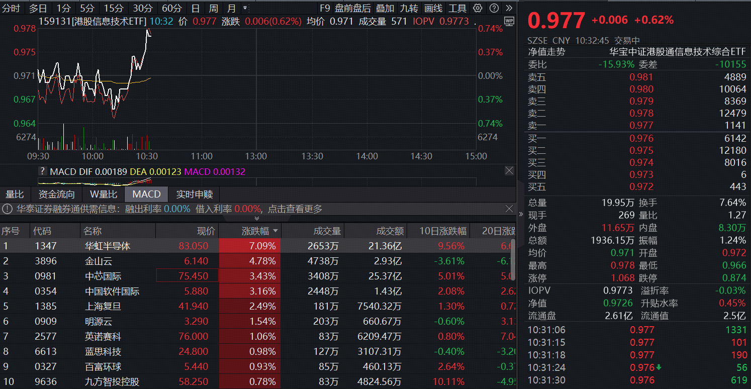 11月18日早盘,港股芯片异动拉升,全市场首只聚焦“港股芯片”产业链的港股信息技术ETF(159131)场内价格拉涨0.62%。成份股中,华虹半导体涨超7%居前,金山云涨近5%,中芯国际、中国软件国际涨超3%。