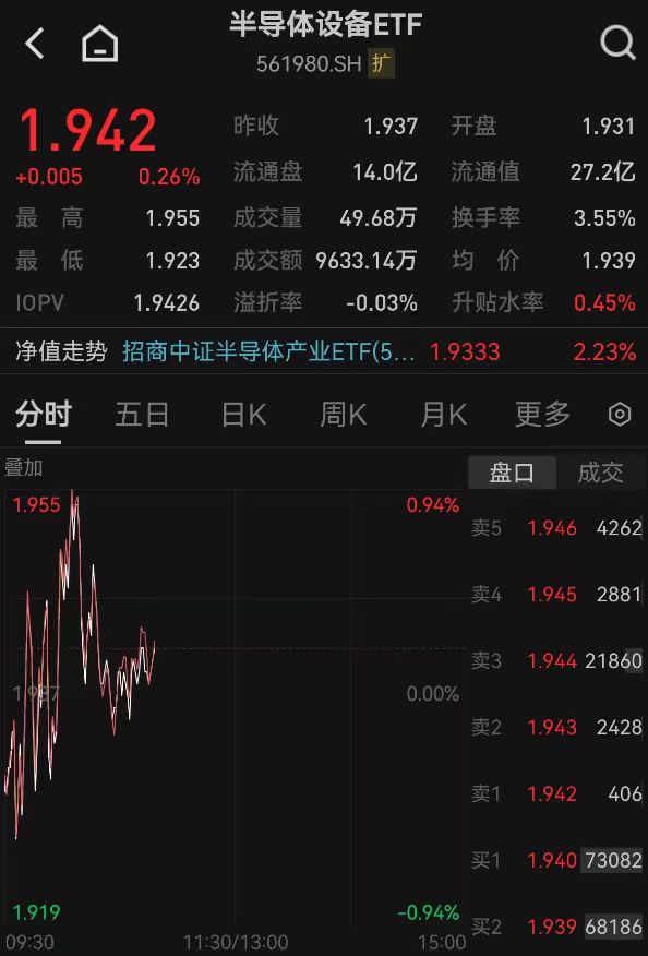 11月19日盘面波动加大,三大指数跳水后迅速翻红,多板块于水面附近震荡。半导体设备ETF(561980)盘中一度拉涨0.88%、目前涨0.26%;成份股南大光电涨超4%、神工股份涨超3%,上海新阳、晶瑞电材涨超1%,中微公司、寒武纪、北方华创、海光信息等多股跟涨。
