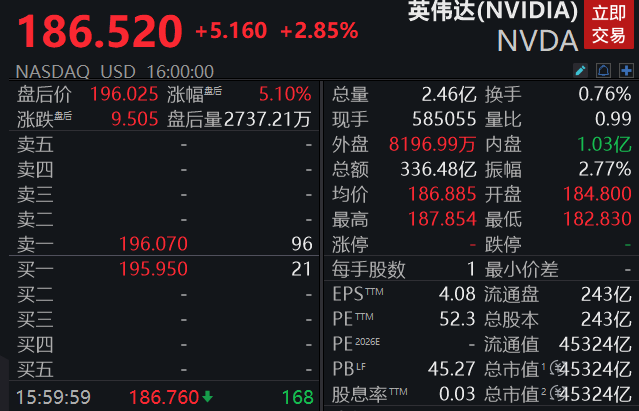 英伟达无疑是当日市场的焦点。公司在盘后公布的2026财年第三财季财报显示,其营收达到了创纪录的570.1亿美元,同比增长62%,远超市场预期的551.9亿美元。净利润也同比增长65%,达到319亿美元,调整后每股收益为1.3美元,高于预期的1.25美元。这一系列亮眼的数据立即引发了市场的热烈反应,英伟达股价在盘后交易中一度飙涨超6%。