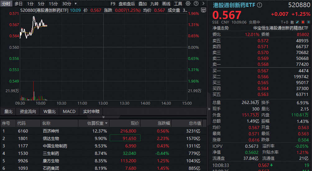 成份股方面,龙头股普涨,信达生物涨超2%,康方生物、石药集团、翰森制药等多股涨超1%。