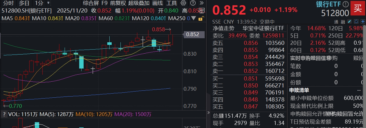 全市场规模最大的银行ETF(512800)场内价格一度上涨1.9%,现涨1.07%,创10月以来的本轮反弹新高!实时成交额9.87亿元,已逼近前一日全天成交额,显示板块情绪显著升温。