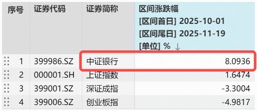 四季度以来,银行板块掀起逆袭行情。截至11月19日,中证银行指数区间累计涨超8%,在所有行业(中证全指二级行业)中排名第二,显著跑赢大盘,较创业板指超额13个百分点,一改三季度领跌颓势。