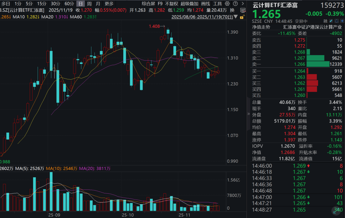 今日(11.20),受到昨晚英伟达超预期财报影响,海外算力链今天逆市走强,算力板块冲高回落,云计算ETF汇添富(159273)盘初一度涨超2%,现跌0.39%,盘中成交额超5200万元。热门成分股中,中际旭创、新易盛涨超1%,中科曙光、浪潮信息微涨;阿里巴巴-W、腾讯控股跌超1%。