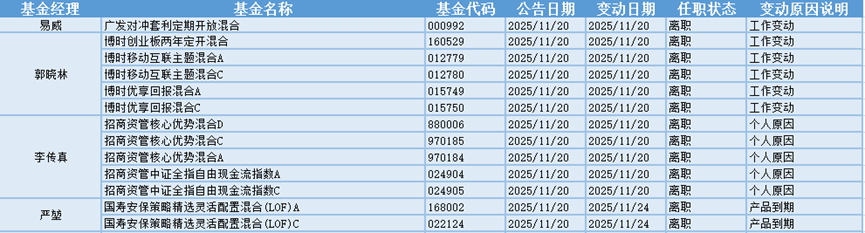 根据巨灵统计的数据显示,近30天(10.21-11.20)共有646只基金产品的基金经理发生离职变动。其中今天(11.20)有13只基金产品发布基金经理离职公告,从变动原因上来看,有2位基金经理是由于工作变动而从管理的6只基金产品中离职,有1位基金经理是由于产品到期而从管理的2只基金产品中离职。有1位基金经理是由于个人原因而从管理的5只基金产品中离职。