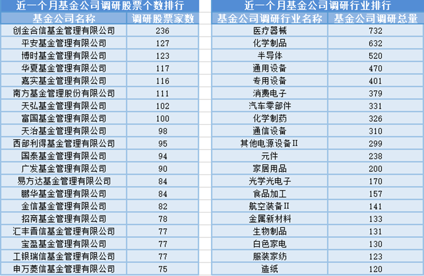 近一个月(10月21日-11月20日),创金合信基金参与公司调研的数量最多,共调研236家上市公司,然后调研较为活跃的还有平安基金、博时基金和华夏基金,分别调研127家、123家、117家上市公司;从调研行业上来看,基金公司对医疗器械行业的上市公司调研次数最多,共有732次,其次是化学制品行业,基金公司调研了632次。