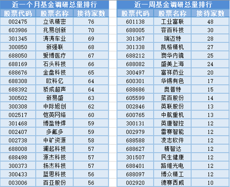 从个股调研情况上来看,最近1个月(10月21日-11月20日)最受公募基金关注的是立讯精密,属于消费电子行业,主营业务为从事消费电子、通信及数据中心、汽车、医疗等领域相关零组件、模组及系统集成业务。共有76家基金管理公司参与调研,其次是兆易创新和涛涛车业,分别接受70家、69家基金管理公司的调研。