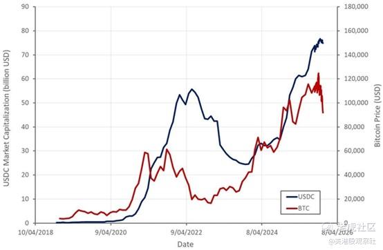 在市场热潮的推动下,第三季度流通中的稳定币总量同比增长59%。本季度Circle的市场份额也升至29%。据报道,稳定币交易量同比增长约130%,其中USDC(Circle发行的美元稳定币)的交易量占比提升至40%。尽管这些数据表现积极,但近期市场回调可能会在短期内抑制稳定币需求。若当前局面演变为熊市或经济衰退,即便存在长期利好因素,USDC的市值也可能大幅缩水。