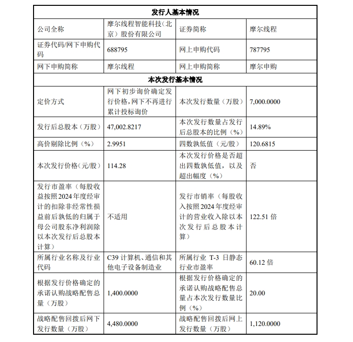 11月20日晚间,摩尔线程公告,首次公开发行股票并在科创板上市,发行股份数量为7000万股,全部为公开发行新股。本次网上发行与网下发行将于2025年11月24日(T日)分别通过上交所交易系统和互联网交易平台实施。发行价格为114.28元/股,预计募集资金总额为80亿元,扣除发行费用后,预计募集资金净额为75.76亿元。