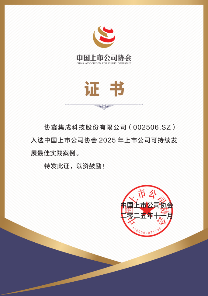 11月18号,由中国上市公司协会主办,中上协可持续发展(ESG)专业委员会承办的2025上市公司可持续发展大会在北京召开。协鑫集成凭借“NEXT预见”可持续治理战略成功入选“最佳实践案例”,彰显了公司在上市公司可持续发展领域的引领地位。