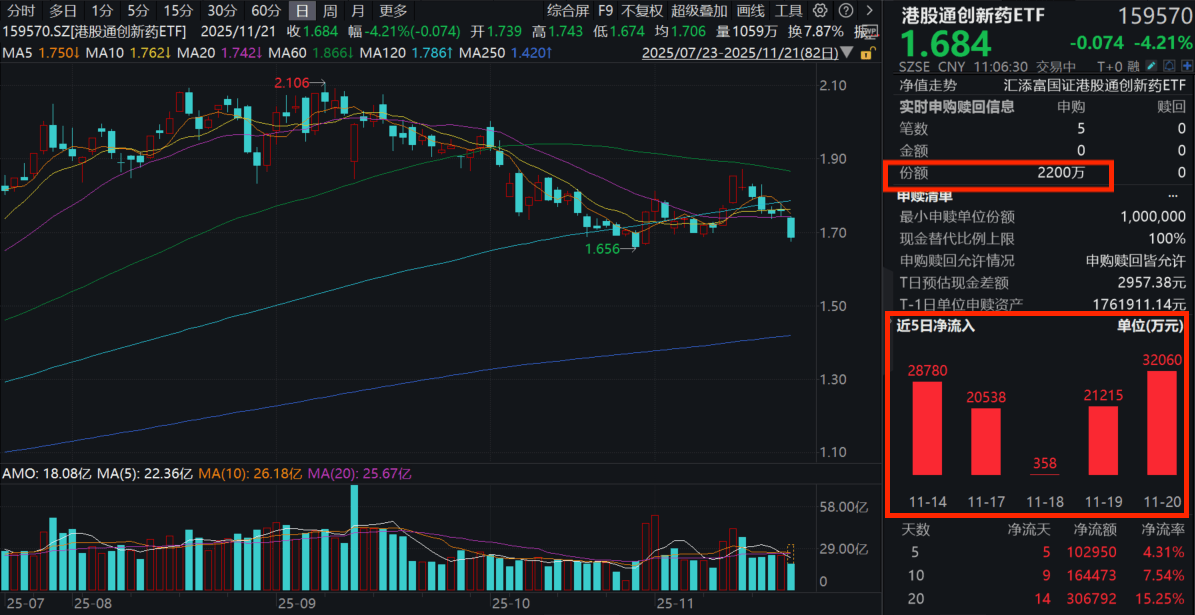 今日(11.21),受海外市场波及,港药深度回调,创新药纯度100%的港股通创新药ETF(159570)一路下探大跌超4%,盘中成交额快速突破20亿元!资金逢跌涌入,盘中净流入近4000万元,近5日累计“吸金”超10亿元!截至11月20日,港股通创新药ETF(159570)最新规模超237亿元,同类持续领先!