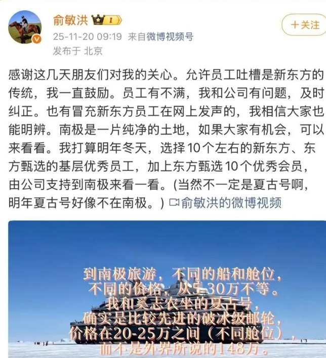针对争议,俞敏洪在最新发言中表示:"感谢这几天朋友们对我的关心。允许员工吐槽是新东方的传统,我一直鼓励。员工有不满,我和公司有问题,及时纠正。也有冒充新东方员工在网上发声的,我相信大家也能明辨。南极是一片纯净的土地,如果大家有机会,可以来看看。"