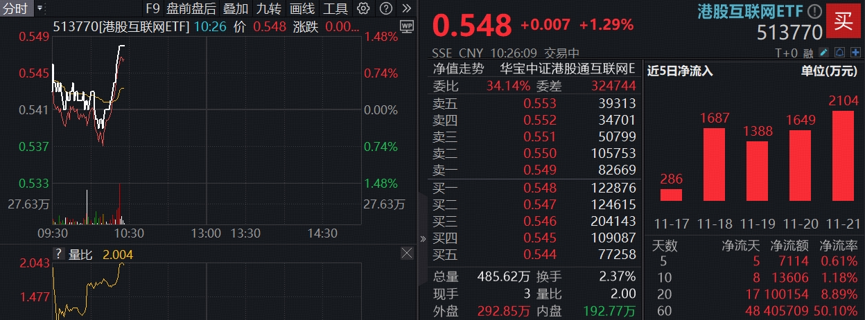 港股互联网ETF(513770)最新规模超109亿元,年内日均成交额超6亿元,支持日内T+0交易,不受QDII额度限制,流动性佳!