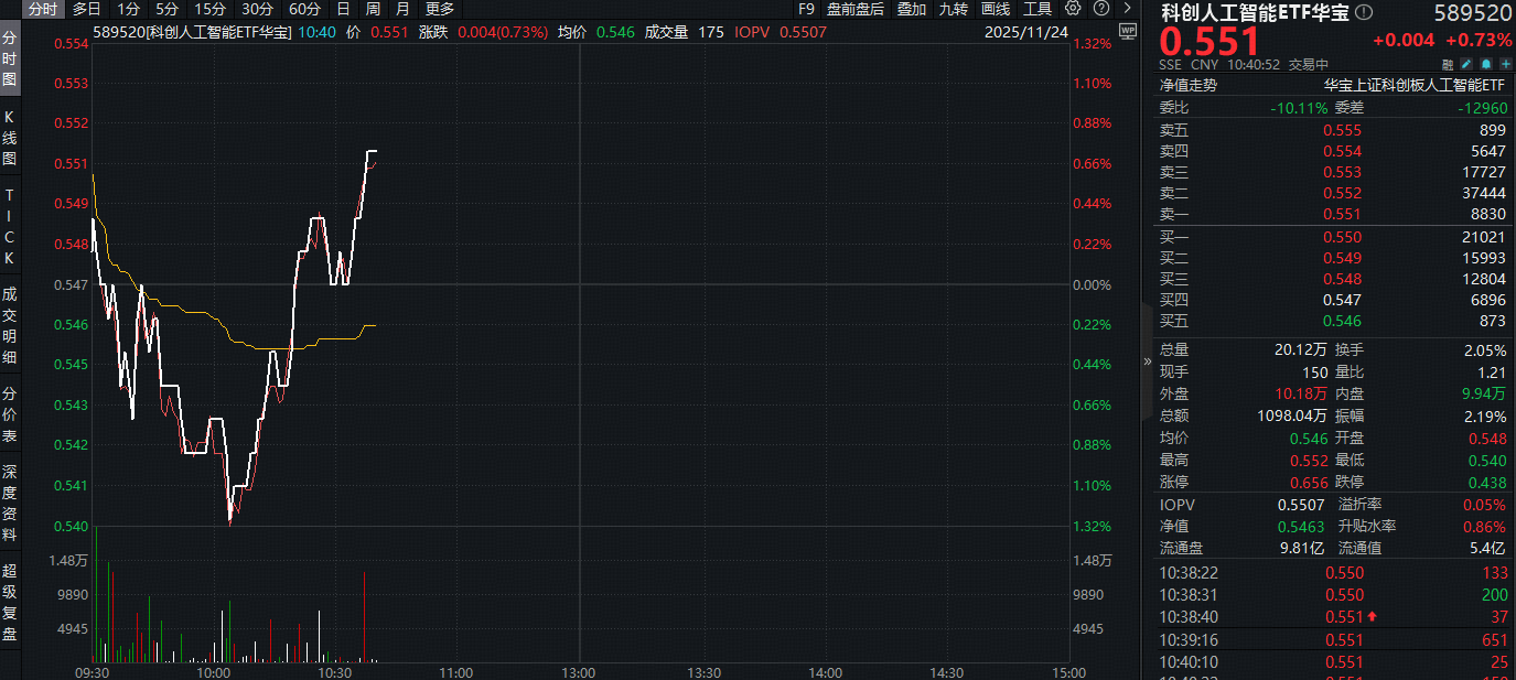 盘面上,今日(11月24日)重点布局国产AI产业链的科创人工智能ETF(589520)早盘“V型”反弹,场内价格现涨0.73%,场内频现溢价区间,或有资金进场抢筹!