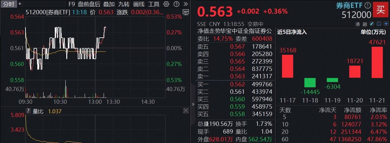 ETF盘中资讯 | 顶流券商ETF(512000)红盘整理,资金逢低吸筹6.6亿元!机构:券商板块β弹性可期