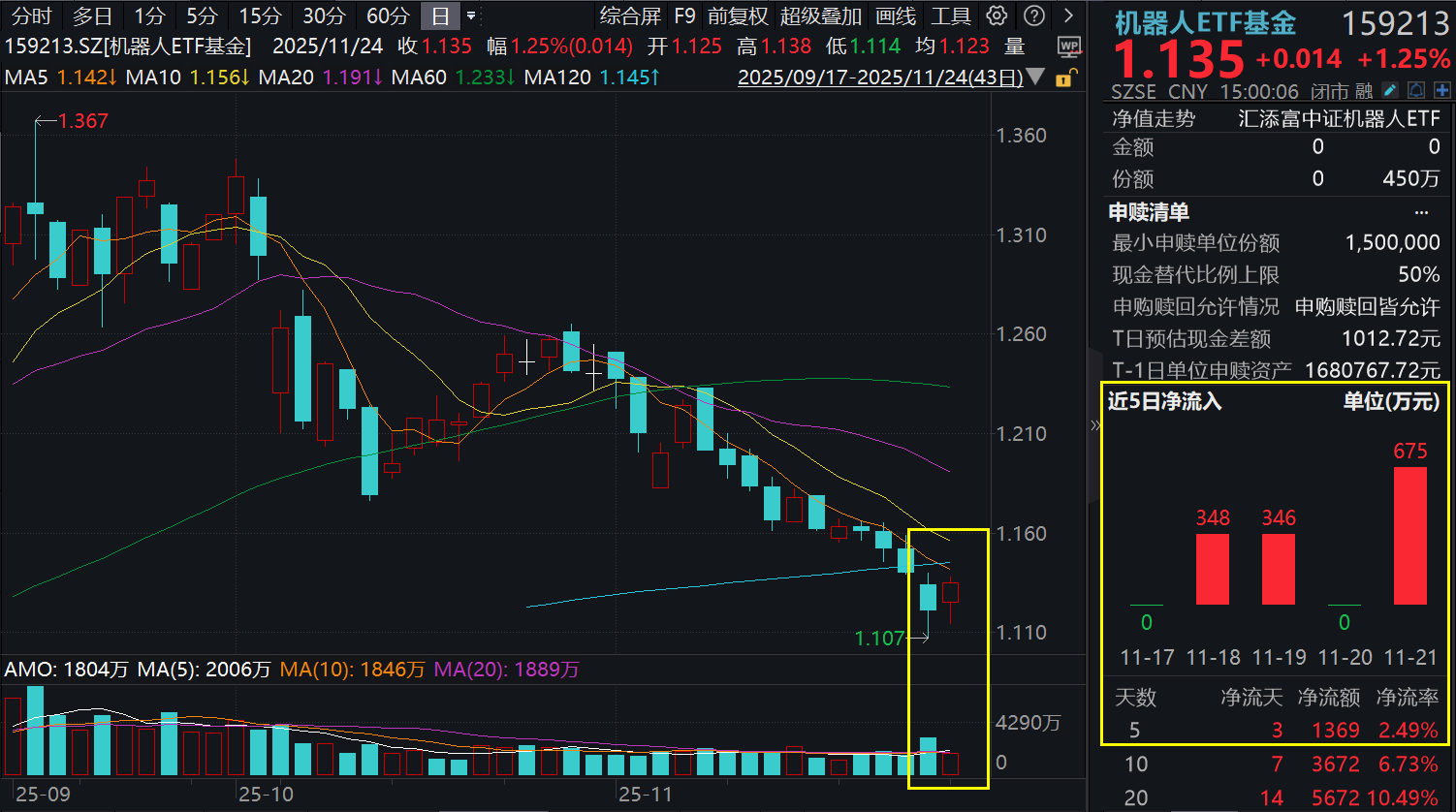 11月24日,A股市场小幅回暖,两市超4200只个股上涨,机器人板块迎来反弹,机器人ETF基金(159213)收涨1.25%,资金近期跑步进场,机器人ETF基金(159213)近5日累计吸金超1300万元!