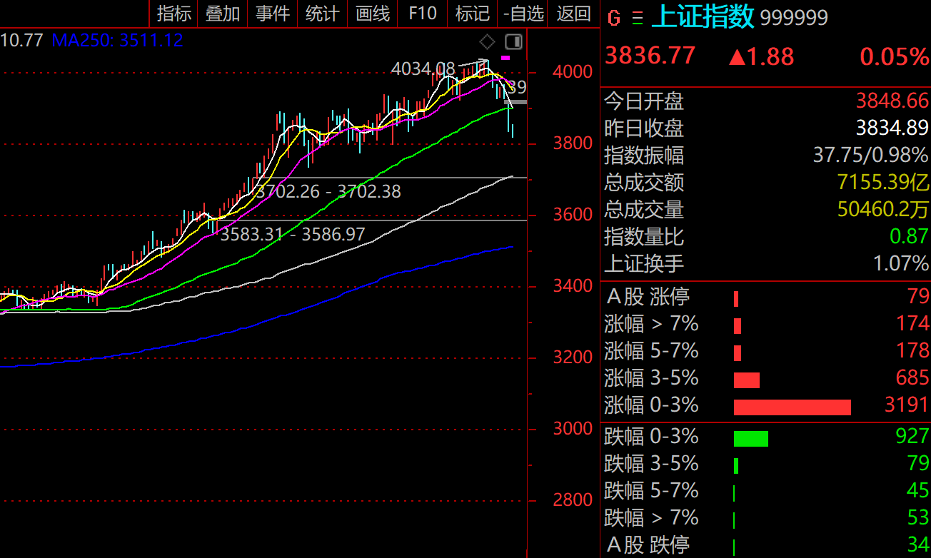 周一,A股如期反弹修复,主要指数呈现平稳运行态势,个股表现较为活跃。根据交易所数据,上证指数收涨0.05%,报3836.77点;深证成指涨0.37%,报12585.08点;创业板指涨0.31%,报2929.04点;科创50涨0.84%,报1296.6点。