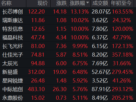 早盘CPO、光通信板块表现活跃,截至发稿板块内5只个股涨停,德科立、瑞斯康达、特发信息、福晶科技、长飞光纤涨停,长芯博创、光库科技涨超10%。