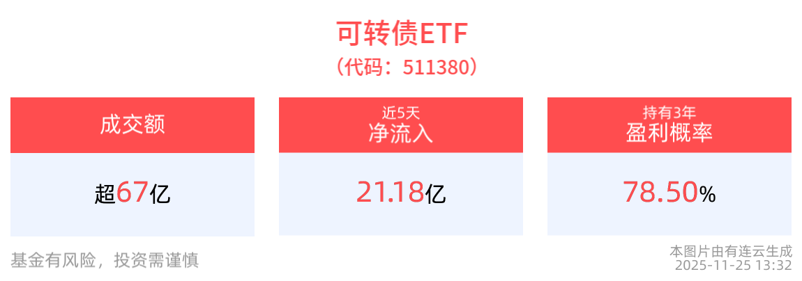 流动性方面,可转债ETF盘中换手11.58%,成交67.47亿元,市场交投活跃。拉长时间看,截至11月24日,可转债ETF近1周日均成交113.13亿元。