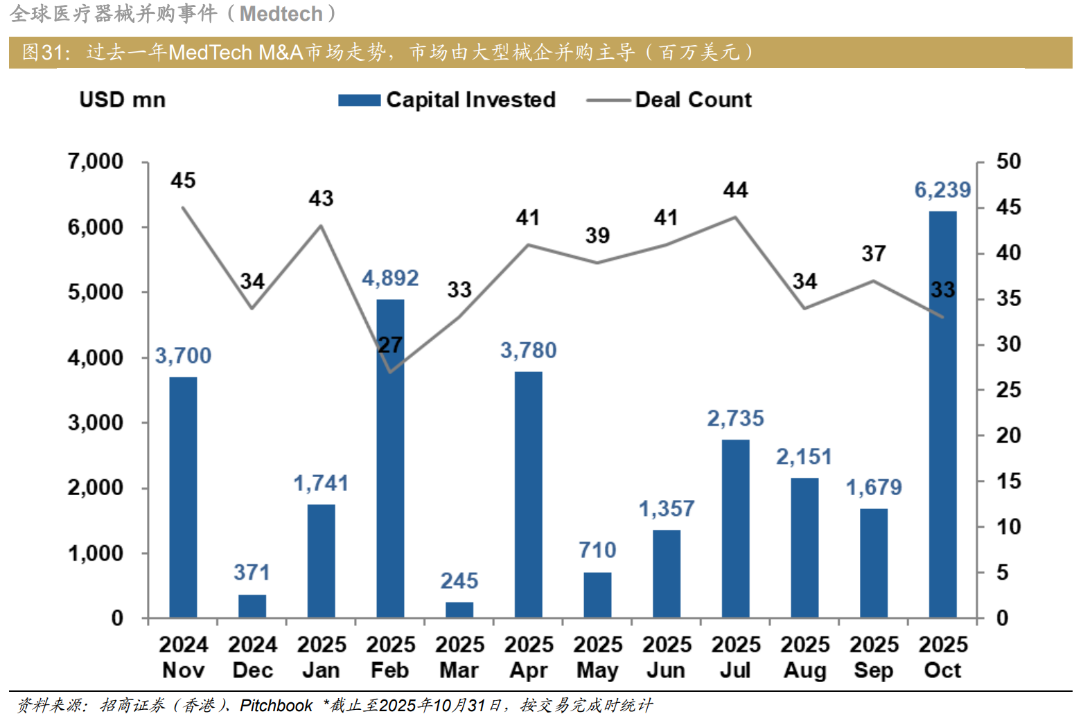 其中,医疗器械领域10月份出现大额并购,聚焦于战略性补强核心业务、拓展高增长潜力细分市场,反映出企业对创新技术的持续投入与信心。