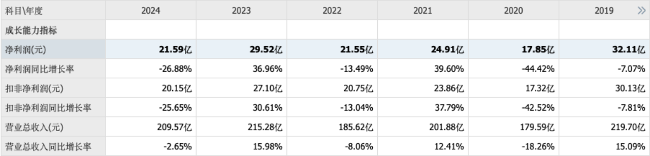 整体来看,近年来,海澜之家的业绩表现不错。招股书显示,2024年,该公司营收为209.57亿元,净利润为21.59亿元。