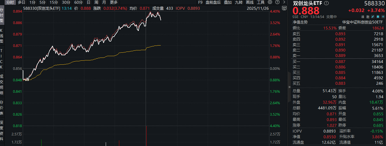 今日(11月26日)创业板+科创板携手大涨,覆盖两个板块高成长龙头的硬科技宽基——双创龙头ETF(588330)震荡上扬,场内涨幅一度上探4.32%,现涨3.74%,盘中收复5日、10日均线,如果今天场内涨幅不断拉升,则有望收复60日均线。